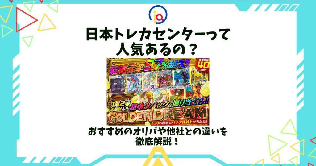 日本トレカセンターはいわゆるオンラインオリパを販売するショップであり、ポケモンカード、ワンピースカード、遊戯王カード、MTGなどを扱っています。ガチャを回すような感覚で利用できる点が特徴となっていて、オンラインで楽しめる点は魅力でしょう。た... -